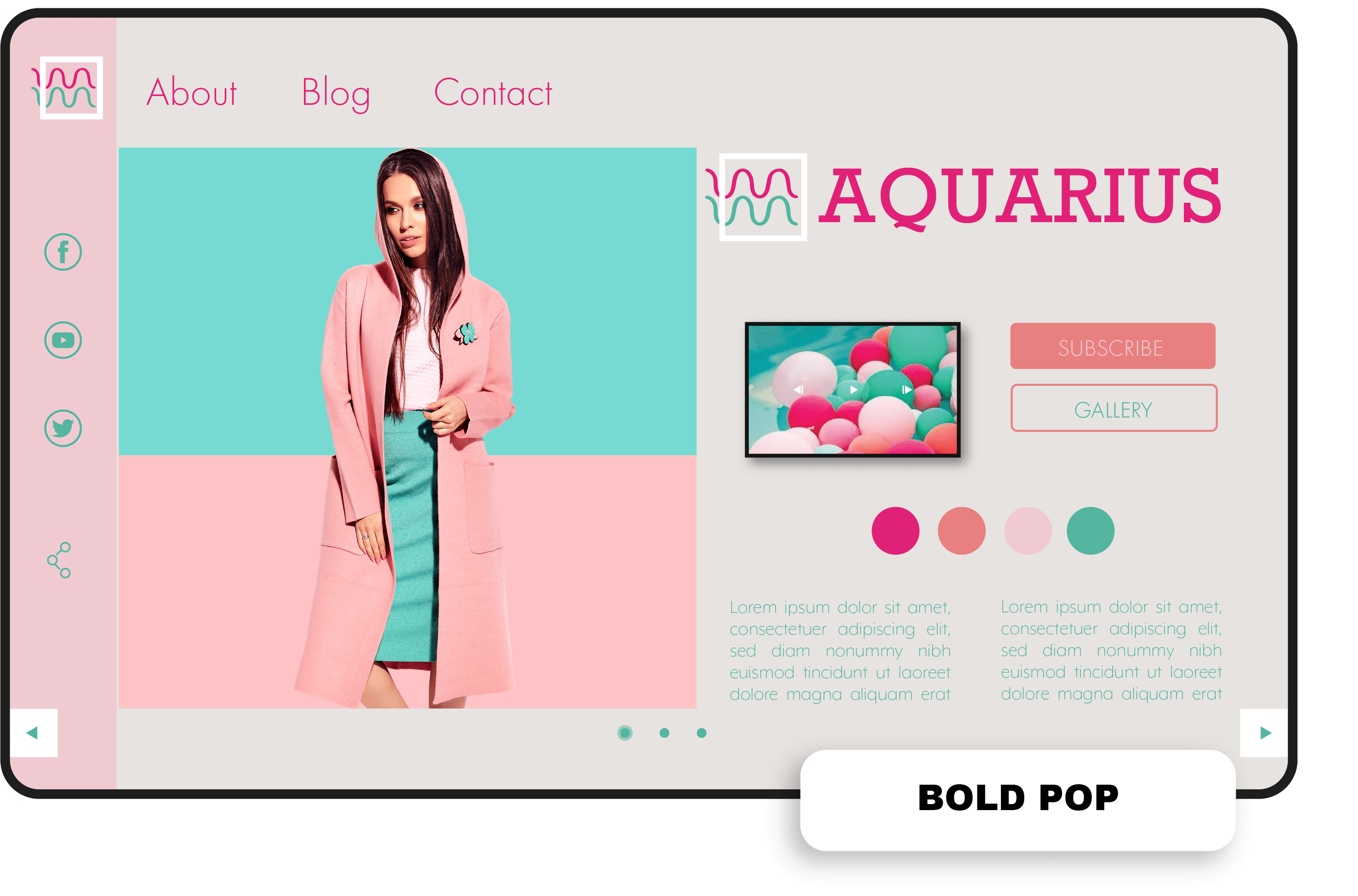The playful pop theme is bold and clear with warm undertones perfect for creative brands. The logo has a strong text based name with a wavy graphic encased in a square.